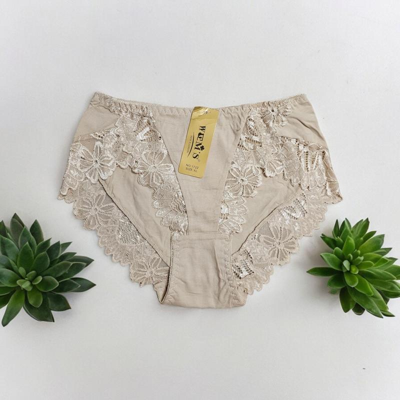 Напівкухлівні жіночі труси. Ззаду та спереду якісне гарне мереживо Матеріал: 95% котон, 5% еластан. Розміри: XL, 2XL, 3XL Колір жіночих трусів: бежевий