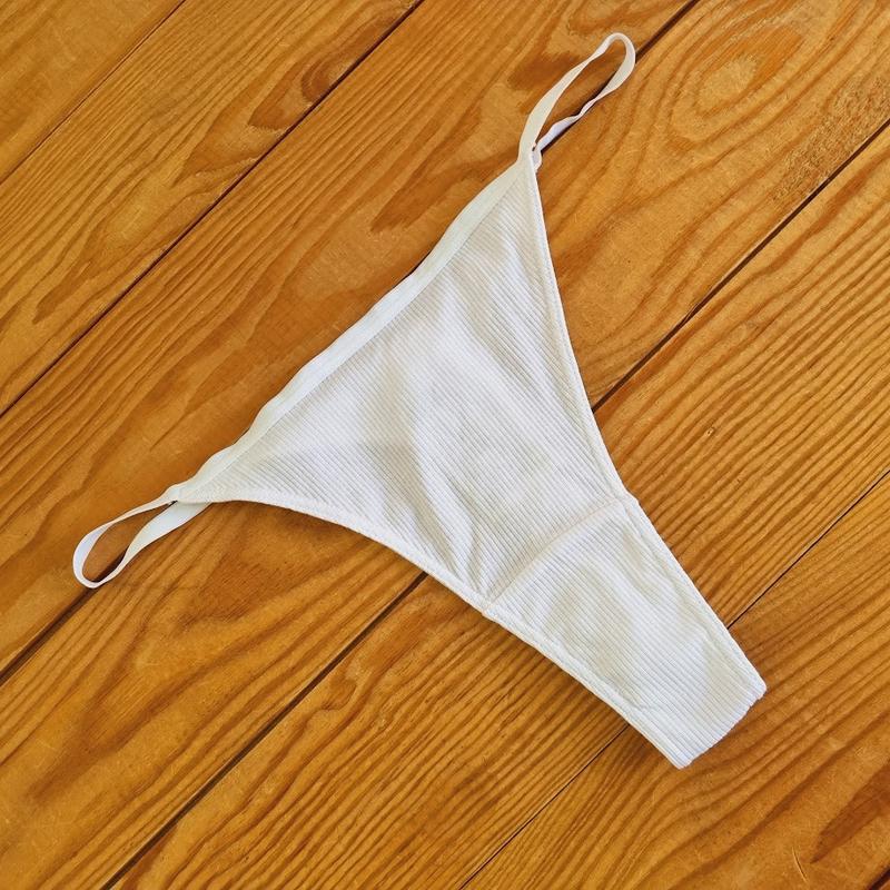 Жіночі трусики-стринги з еластичного полотна в рубчик від бренда H&M Колір: Білий Склад: 95% бавовна, 5% еластан. Розмір S Напівобхват талії 31 см, висота спереду 19 см.