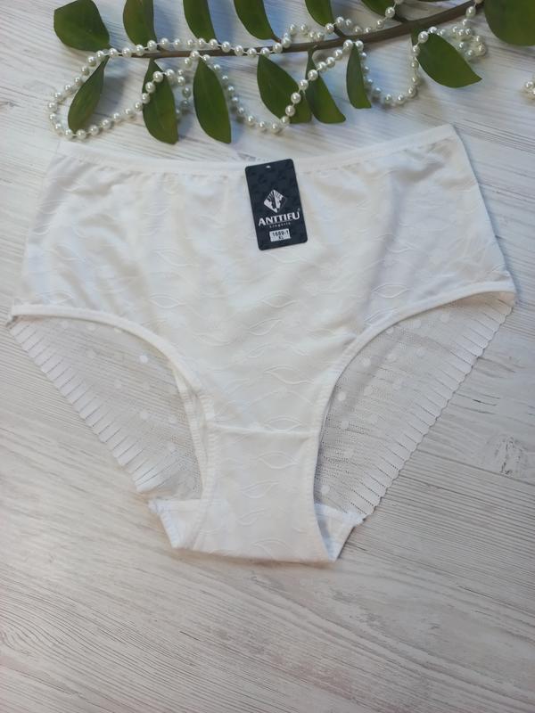 передня частина трусиків виконані з дихаючої тканини з перфораціею, позаду тканина з бавовни в рубчик з оздобленням сіточкою розмір виробника XL орінтуйтесь на заміри: напівобхват резинки по талії 32см. максимально тягнеться до 58см. висота трусиків 31см.