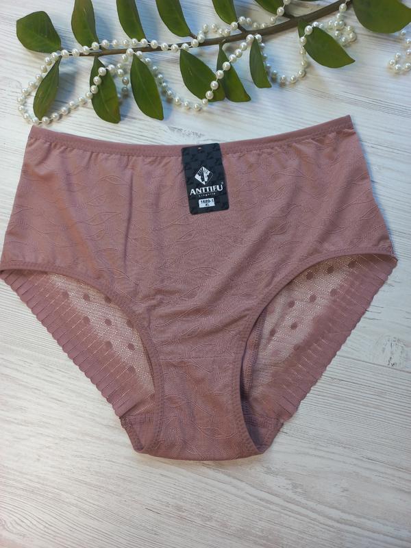 передня частина трусиків виконані з дихаючої тканини з перфораціею, позаду тканина з бавовни в рубчик з оздобленням сіточкою розмір виробника XL орінтуйтесь на заміри: напівобхват резинки по талії 32см. максимально тягнеться до 58см. висота трусиків 31см.