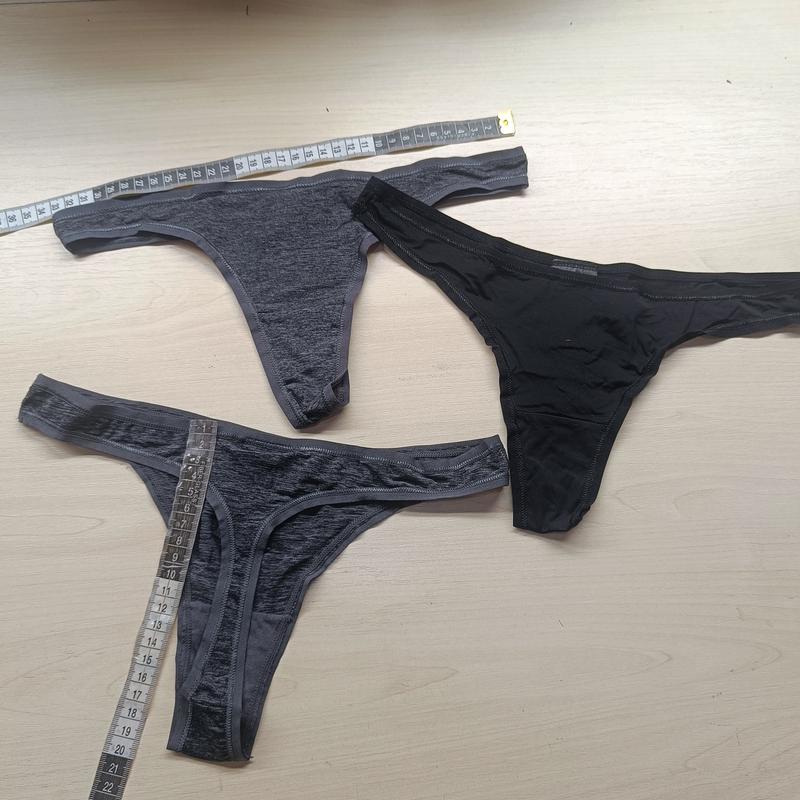 Трусики стрінги, тонка тканина,приємна до тіла, під одягом майже не помітні. Розмір М,заміри є на фото. В наявності 2 сірих і 1 чорні