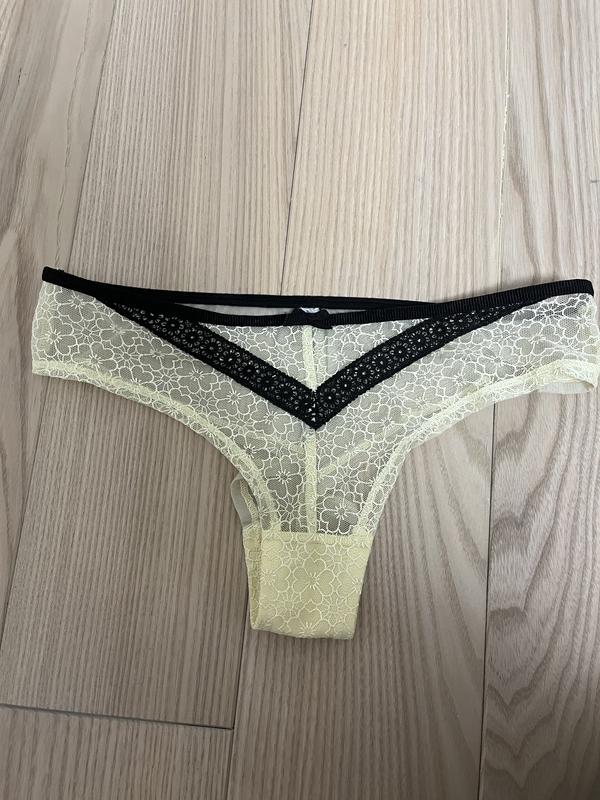 Трусики-бразильяни з кружева. Колір лимонний у поєднанні з чорним. Розмір S. Сток. Нові. Без етикетки.