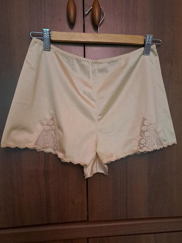 Жіночі трусики з приємного трикотажу, 95% поліамід ,нейлон, 5% котон. Тонкі, майже невагомі. Модель- шортики, під одягом не буде помітно. Спереду трикутні вставки з мережива в тон . Пос.-48, висота бічної частини- 27 см. Вироблено у Франції.