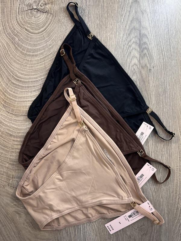 Набір оригінальних трусиків Victoria’s Secret. Розмір S. Кольори шоколадний, чорний, бежевий з золотим лого.