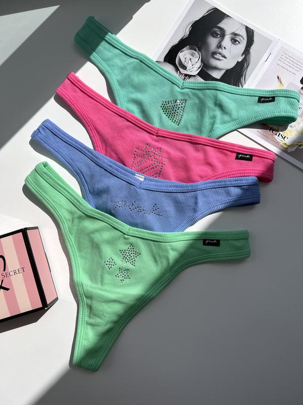 Набір котонових трусиків стрінг в рубчик з камінчиками victoria’s secret