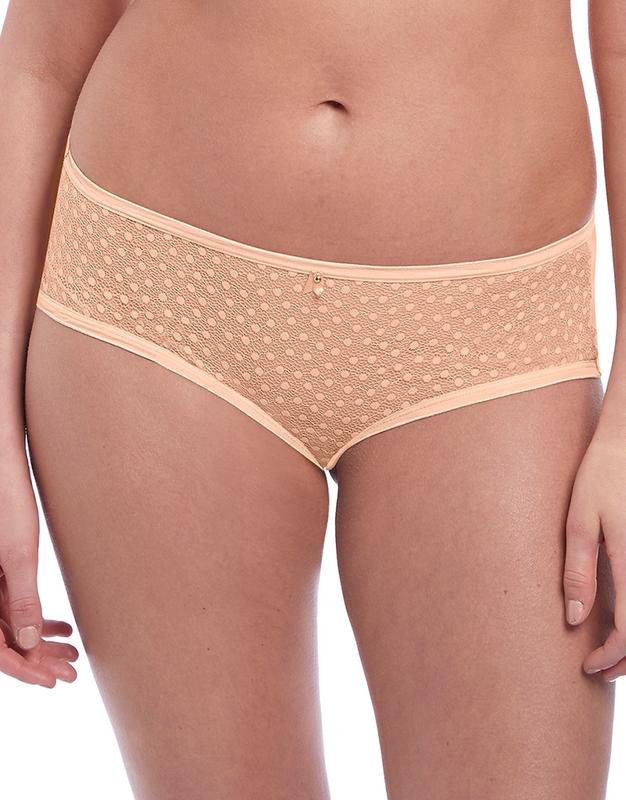 Фасон : Бойфренди, шортики Тип : класичний; фулкавер Колір: беж Бренд : Freya Вироблено: Шрі Ланка Склад полотна : 82% нейлон/поліамід, 18% еластан; ластовиця: 100% котон. Дизайн тканини : задня частина: гладеньке полотно з лазерним зрізаним краєм; передня: Мереживо+Бежева сітчаста основа Вид конструкції : Без швів на завдній частині; попереду прикрашено бантиком Посадка (талія) : Середня Доступні розміри: xl/18/42