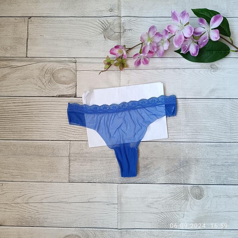 дуже ніжні красиві трусики стрінги з білизняний сітки. Колір синій "Електра". Пояс не широке мереживо. Бирка зрізана. На розмір S. ширина 31 см, тягнуться до 44 см, висота 19 см.