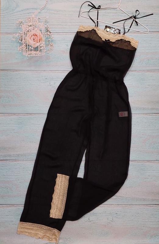 Комбінезон полупрозорий для спання River island р. S/36/8 , зв'язки на атласних стрічках, пл талії резиночка, широкі вільні штанини з мереживом. Дуже шикарна річ. Ціна на бірці 40 фунтов (1800 грн.). ПОГ 41 см ПОТ - резинка в ненатянутому стані 35 см + добре тягнеться ПОБ 53 см (вільні) Довжина штанів від талії (резинки) 104 см K-17