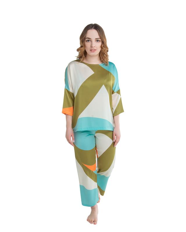 Жіночий костюм, штани та блуза, відмінна якість, приємна та охолоджуюча тканина. Тканина: Шовк штучний, color block-геометрія Склад: 97% поліестер, 3% еластан Зріст моделі 158 cм Обхват грудей: 85 см, талія: 70 см, стегна: 92 см
