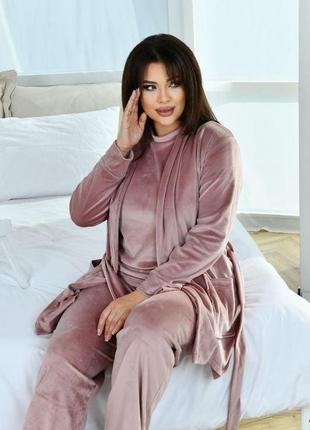 Домашній велюровий комплект трійка|пудра р.50-56