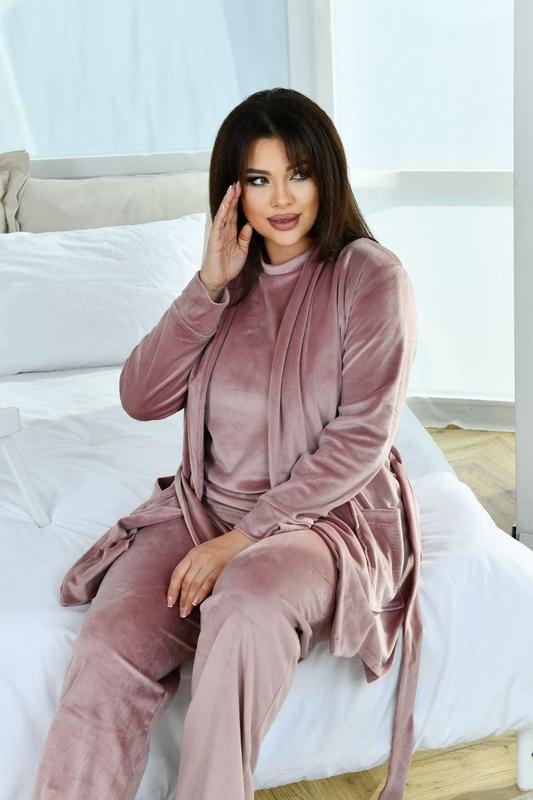 Жіночий домашній велюровий комплект ТРІЙКА складається із халату+футболки+штанів Укорочений халат на запах доповнює пояс. Штани вільного крою середньої посадки. Розміри: 46-48, 50-52, 54-56 Тканина; королівський велюр (Турція) Кольори: сірий, бузковий, пудровий, смарагдовий, бордовий, електрик, моко, чорний Виміри: Футболка 📌Обхват грудей (46-48)-108см, (50-52)-118см, (54-56)- 128см 📌Обхват талії (46-48)-100см, (50-52)-110см, (54-56)-120см 📌Довжина: (46-48)-63см, (50-52)-65см, (54-56)- 66см Халат: 📌Обхват грудей (46-48)-108см, (50-52)-118см, (54-56)-128см 📌Обхват талії (46-48)-100см, (50-52)-110см, (54-56)-120см 📌Довжина: (46-48)-82см, (50-52)-83см, (54-56)-85см 📌Довжина рукава від горловини: (46-48)68см, (50-52)-70см, (54-56)-72см Штани 📌Обхват талії (46-48)-66-86см, (50-52)-78-98см, (54-56)-88-108см 📌Обхват стегон (46-48)-104см, (50-52)-116см, (54-56)-128см 📌Довжина (46-48)-107см, (50-52)-108см, (54-56)-109см