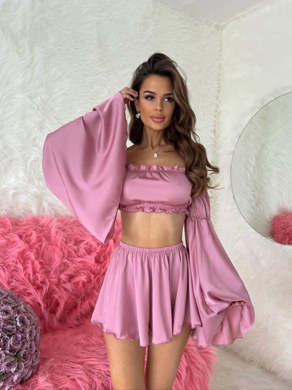 Комплект для дому Шорти+топ ст. 746 Матеріал шовк Сатин 90% поліестер, 8% віскоза, 2% еластан Розміри 42-44,46-48 Кольори: фісташка, пудра, молоко, червоний, чорний, смарагд, електрик Ціна 1100 грн