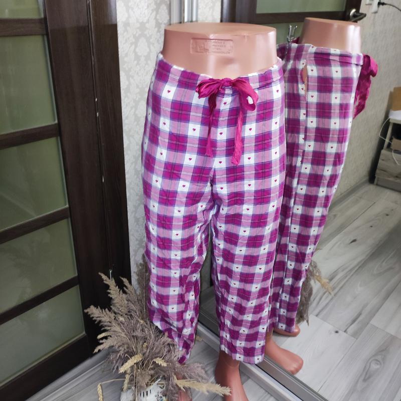 Пропоную вашій увазі штани для спання/піжамні штани/штани для дому Розмір: на бірці M/L Стан: хороший Дефекти: по боках розійшлося по швах Колір: рожевий Принт: клітинка та сердечка Сезон: літо/весна/зима/осінь Склад: 100% котон Заміри: НОТ 45см Довжина 88см посадка 27см