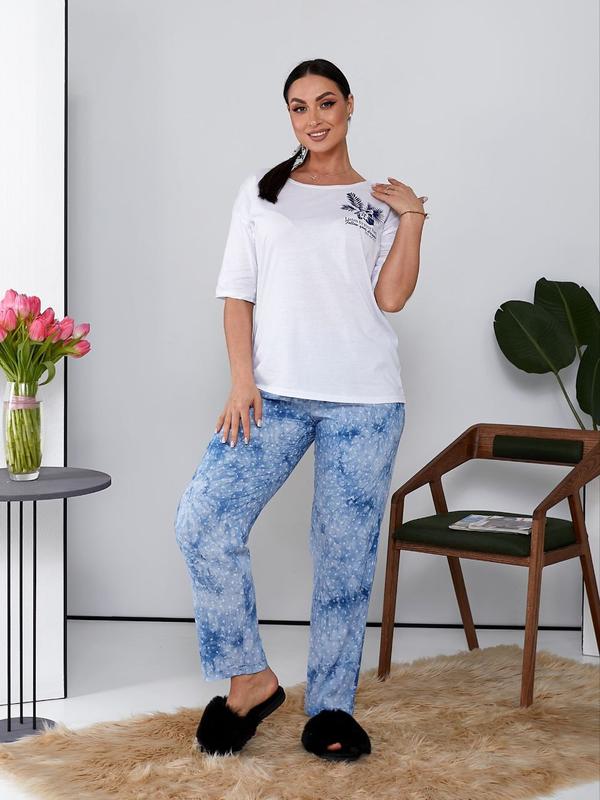 Пижама Розміри 52, 54, 56, 58 Футболка - 100% бавовна Штани - 75% штапель, 25% бавовна ( не тягнуться) Довжина футболки 63 см. Довжина рукава від шиї 45-46 см. Довжина штанів 105-108 см. Розмір//ОГ//ОС 52 - 118 - 124 см. 54 - 122 - 128 см. 56 - 126 - 132 см. 58 - 130 - 140 см. тж
