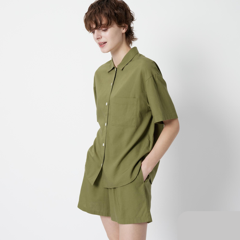 Склад: 70% віскоза, 30% льон Linen Blend Short Sleeve Pajamas виготовлена зі спеціально розробленої суміші льону з натуральним відчуттям верх вільного крою з коміром сорочки та передніми кишенями шорти з еластичним поясом зі зручними бічними кишенями чудовий варіант одягу для сну, роботи вдома чи носіння на вулиці