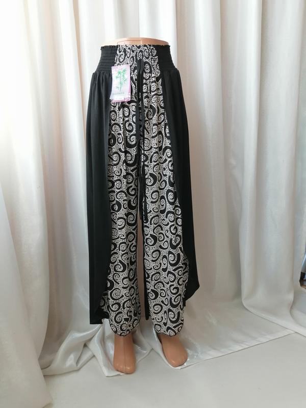 штани кюлоти натуральна бавовна батист легка невагома тканина в наявності два принта розміри M-L і XL-XXL розмір вказаний на бирці подвійний штани в талії шалено тягнуться Широка прошита гумка декоративна куліскою на талії штани внизу закругленого крою тому точну довжину заміряти просто неможливо постараюсь максимально описати виміри розмір M-L талія нагадаю Широка прошита гумка яка дуже добре тягнеться 50 см потягнеться на 100 см стегна 82 см тягнеться на 115 см посадка спереду 36 см ззаду 40 см довжина штанів по внутрішньому кроковому шву 60 см по зовнішньому шву довжина чорного матеріалу 88 см розмір XL-XXL талія нагадаю Широка прошита гумка яка дуже добре тягнеться 52 см потягнеться на 102 см стегна 86 см тягнеться на 120 см посадка спереду 37 см ззаду 41 см довжина штанів по внутрішньому кроковому шву 60 см по зовнішньому шву довжина чорного матеріалу 88 см Допускаю похибку вимірах плюс-мінус 1 см