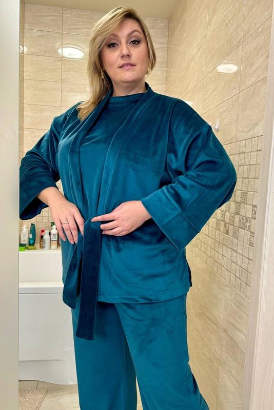 Дуже гарний колір домашнього костюму , одяг справжній королеви! Великі розміри, комфорт та краса все це є у цьому костюмі! Виробленно в Україні з гордістю! Склад: королівський велюр на бавовняній базі Розміри до xxxl! Кольори: чорний, ізумруд, капучино, пудра!