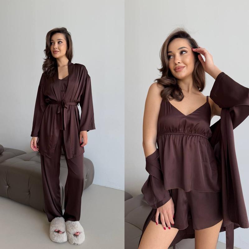 Комплект 4 в 1 Халат + майка + шорти + штани ⚫️Розміри: S(40-42), M(44-46), L(48-50) ⚫️Майка на регульованих бретелях, ⚫️Шорти, штани на високій посадці вільного крою. ⚫️ Довжина халата 74-75 см, штани 100-101 см, шорти 32-33 см Матеріал: шовк ◾️Розмірна сітка S груди: 80-86 см, стегна: 84-92 см. М груди: 87-93 см, стегна 93-100 см. L груди 94-100см, стегна 100-108см Мод 173