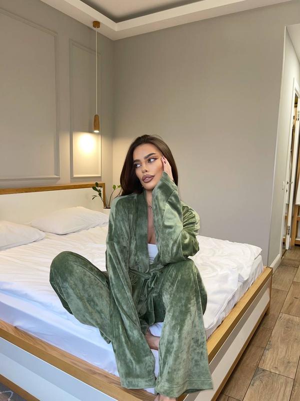 Теплий домашній костюм з велюру широкі штани та кімоно