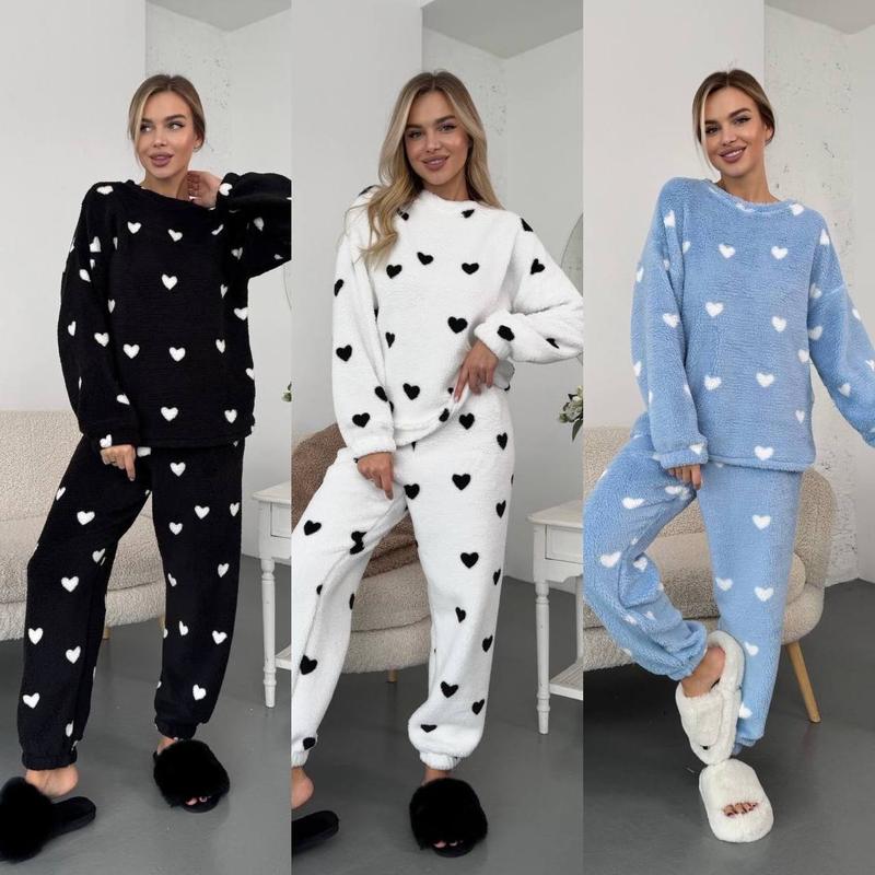 Домашній костюм арт.1702 Матеріал: хутро Тедді (дуже тепла та м’яка) Розміри: 42-44, 46-48, 50-52 Кольори: чорний, рожевий, блакитний, білий з рожевими 🩷, білий з чорними 🖤