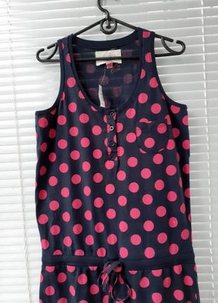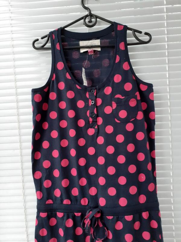 Ромпер темно-синего цвета в розовый горох. Длина 147 шаг 72 пог 42 поб 48 тянеться