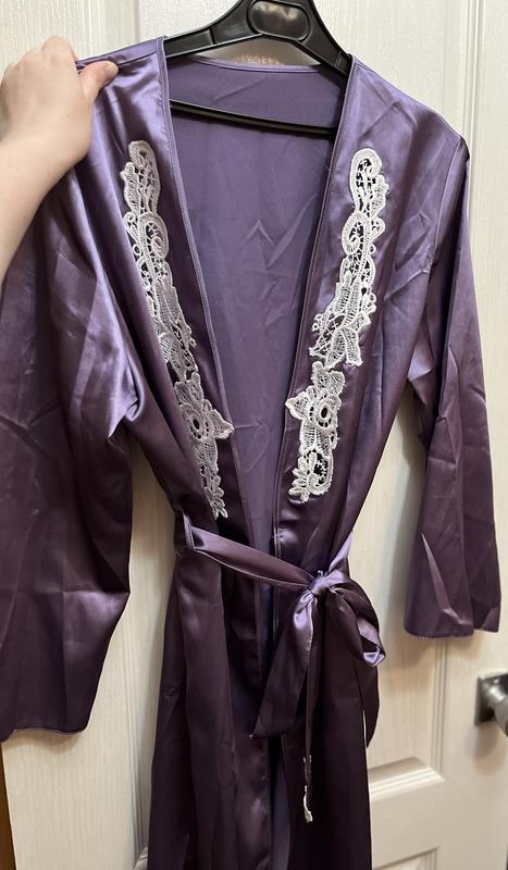 Дуже дорого виглядає, в ідеальному стані, як новий, потрібно тільки пропрасувати) Колір: бузковий з білою вишивкою Всередині зав'язується з однієї сторони+ пояс зверху Довжина рукава -51 см Довжина халата -92 см Плечі-44 см