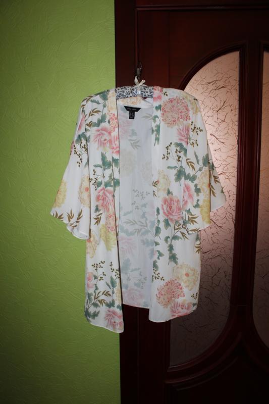 Красива накидка, халат, розмір 12 від New Look. Стан ідеальний, без дефектів. Моделька без пояса, але я можу запропонувати при бажанні білий поясок. Заміри по спинці: довжина від середини плеча 80см, ПОг по спинці 59см, ПОБ по спинці 57см.
