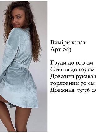 У КІЛЬКОСТІ Неймовірний Хіт Продажів 🔥 Стильно, затишно, тепло❤️ Ідеальні велюрові халатики для вас! Ціна 650 грн🔥 Арт 083 Тканина: велюр доброї якості Колір: пудра, сіро-фісташковий, чорний Розмір: 42-46 універсальний М'який,дуже комфортний халат який стане твоїм улюбленим🥰 ▫️▫️▫️ Виміри халат Арт 083 Груди до 100 см Стегна до 103 см Довжина рукава від горловини 70 см Довжина 75-76 см Зріст моделі 166 см