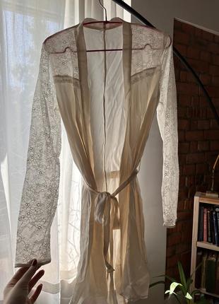 Витончений халат ручної роботи з мереживними орнаментами, завдяки яким халат виглядає просто неймовірно! З мереживним верхом та рукавами це одночасно урочиста розкіш та демонстрація витонченого смаку. Дуже м'яка та легка тканина. Шовк-сатин, абсолютно новий, Бренд Intimissimi.