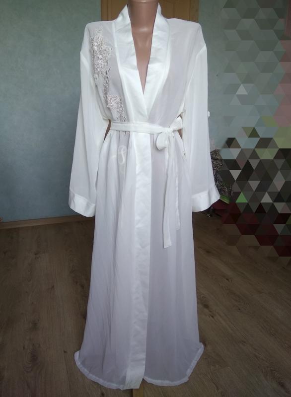Ніжний довгий прозорий жіночий халат під пояс з довгими рукавами/пеньюар з вишивкою Бренд kaleidoscope Розмір з етикетки 16. Орієнтуйтесь за замірами. Довжина 124 см. Довжина рукава 52 см. Плечі по спинці 47 см. Заміри зроблені в розкладеному по швах вигляді По грудях 56 см, талії 54 см, стегнах 62 см. Половинки халата перекривають одна одну внизу на 17 см, тому халат може підійти власниці з більшими показниками в замірах. Максі халат-пеньюар молочного кольору (колір айворі, шампанського, кремовий).Тканина прозора матова. Довгі рукави з атласними манжетами, атласна планка. Без кишень. Є внутрішня підтримуюча зав'язочка (див. фото). Фасон на запАх під пояс. Ніжна вишивка квітів. Халат не був у використанні. Бренд-бірка на фото