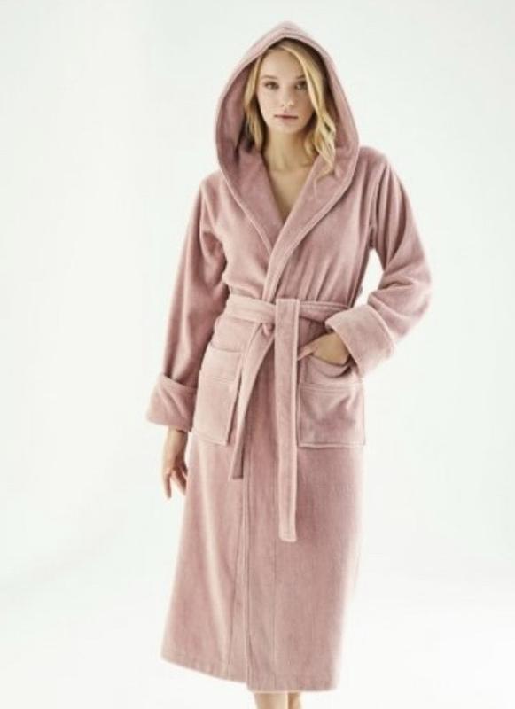 Тканина: верх - велюр, всередині - махра; Склад: 50% бамбук, 50% бавовна Виробник: ТМ Nusa (Турция). Колір: пудра (рожевий) З капюшоном Довгий жіночий махровий бамбуковий халат з капюшоном з кишенями та з поясом. Прикрашений кантами. Розмір: С !Продаю, оскільки не підійшов розмір. Повністю новий з етикеткою!