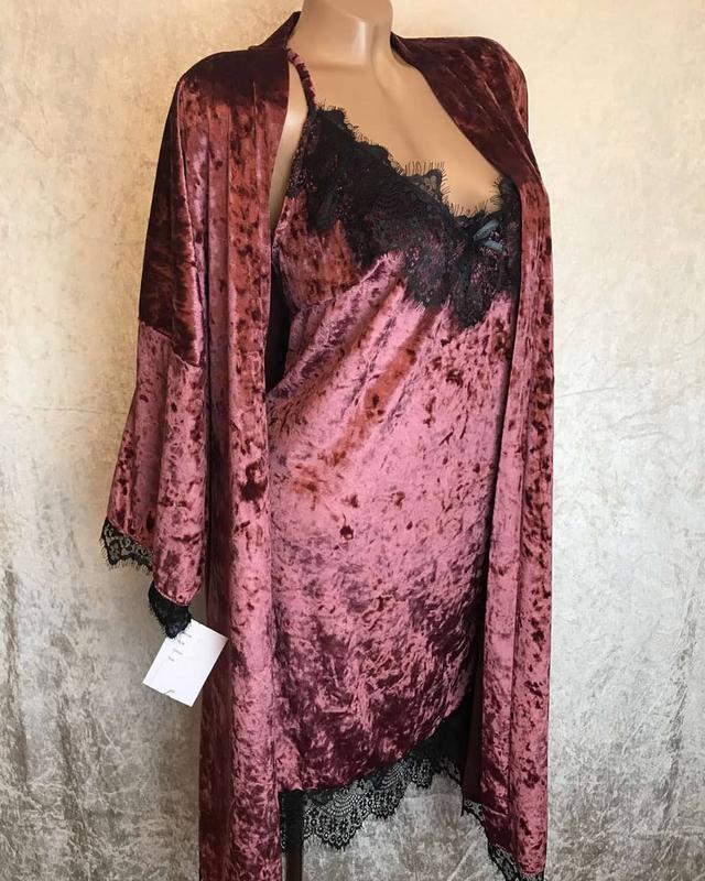 М'який, мармуровий велюр рожево - персиковий колір, з ніжною мереживною обробкою. Комплект складається з халата і пеньюара. Халат на запах, рукав 3/4, пояс в комплекті. Довжина халата і пеньюара до 1 метра. Пошиття на замовлення. Приємний до тіла, та й виглядає розкішно! Запрошую відвідати мій магазин, щоб переглянути безліч різних піжам, різні кольори та типи тканин. Ціни Вас приємно здивують! Заходьте, вибирайте, відповім на всі питання.