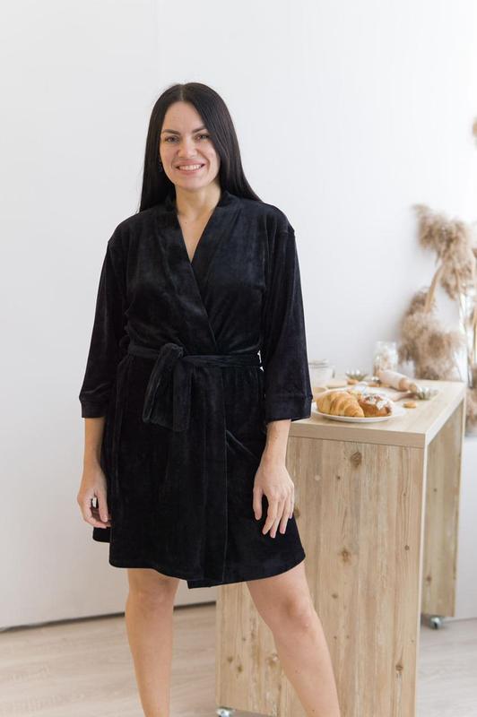 Халат довгий Довжина та заміри в таблиці Кольор : чорний 💜 є зав'язка в середині ♥️ пояс фіксується на брителі 💜 рукав 3/4 широкий Тканина : велюр плюш на котоновій основі Ціна 600 * на моделі розмір З