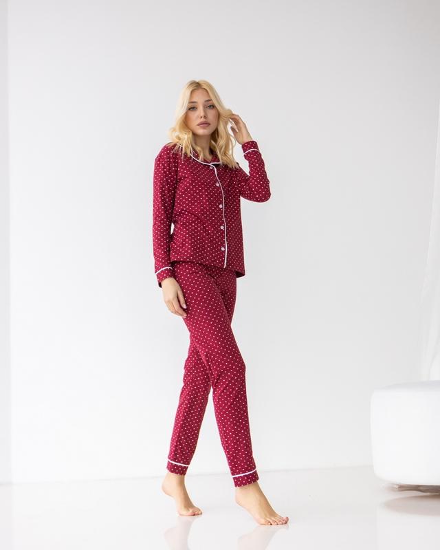 На моделі розмір М ВИМІРИ (напівобхват грудей / довжина кофти / довжина рукава / полуобхват стегон / довжина штанів / внутрішній шов): M (45/61/57/48/105/77); X L (51/63/60 / 51/110/79) Матеріал: 95% бавовна, 5% еластан.,колір малиновий