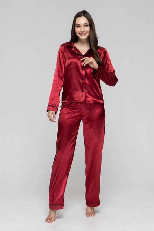 Атласна піжама сорочка з довгим рукавом та штани Шикарна атласна піжама для нічного сну та домашнього відпочинку від інтернет- магазину GorLin, поєднує в собі абсолютний комфорт та стильний дизайн. Вільний крій сорочки та штанів дозволяє насолоджуватись відпочинком в повній свободі, не обмежуючи рухів. Приємна на дотик тканина атлас огорне ваше тіло по силуету, даруючи ніжні відчуття. Атласна піжама зі штанами чудово сідає по фігурі, надаючи витонченого вигляду. Домашній костюм жіночий з атласу не просто вбрання для сну, але і вираз вашого власного стилю та бажання насолоджуватися кожним моментом відпочинку. Завдяки спеціальному плетінню ниток, атласна тканина має блискучу та гладеньку поверхню, надзвичайно міцна, добре пропускає повітря, та не порушує терморегуляцію. Такий одяг для сну ідеально підходить на будь-який сезон і має благородний вигляд. Купити піжаму жіночу Кожна деталь комплекту гармонійно поєднується, створюючи ідеальний образ для затишних вечорів та забезпечує комфорт для солодких снів. Сорочка з довгим рукавом застібається на чотири ґудзики, що значно полегшує її одягання. Стильний відкидний комір надає сорочці галантного вигляду. Манжети на рукавах забезпечать зручність під час сну, щоб не закочувались рукава та збережуть тепло. Чорний кант, що обрамлює сорочку та невеличка кишеня з лівої сторони на грудях слугують як декор, створюючи особливий дизайн. Бордовий колір сорочки чудово комбінується з чорним кантом надаючи контрасту та елегантності. Домашні штани жіночі легкі та зручні, на поясі еластична резинка, яка дозволяє регулювати посадку до ваших вподобань. На штанах присутні манжети обрамлені кантом. Штани домашні жіночі з атласу лагідно спадають по контуру тіла, підкреслюючи усі жіночі принади та надають гламурного вигляду. Піжама жіноча зі штанами ідеальний вибір для тих хто хоче виглядати бездоганно завжди та дбає про комфорт та гігієнічність під час відпочинку. Сорочка з довгим рукавом та піжамні штани жіночі неодмінно стануть улюбленим домашнім комплектом! Ви можете купити красиву жіночу піжаму на подарунок близькій людині, та порадувати якісним та стильним комплектом. Так піжама не втрачає колір та форму. Стильні піжами оптом В інтернет-магазині GorLin представлений широкий вибір домашнього одягу та жіночих піжам різних розмірів, кольорів та дизайнів. Ви можете замовити одяг оптом за приємними цінами або купити в роздріб. В кожної жінки в гардеробі має бути присутній красивий та зручний піжамний комплект, адже це так приємно мати неперевершений вигляд навіть під час відпочинку чи зайняттям домашніми справами. Наші консультанти завжди готові допомогти підібрати найкращий одяг для відпочинку, який буде радувати вас. Розмірна сітка піжами Розмір Обхват грудей Обхват стегон Довжина штанів Довжина сорочки Довжина рукава 44 (S) 96 96 100 55 60 46 (M) 100 100 100 56 60 48 (L) 106 106 100 57 60 50 (XL) 112 112 100 58 60 52 (XXL) 116 116 100 58 60