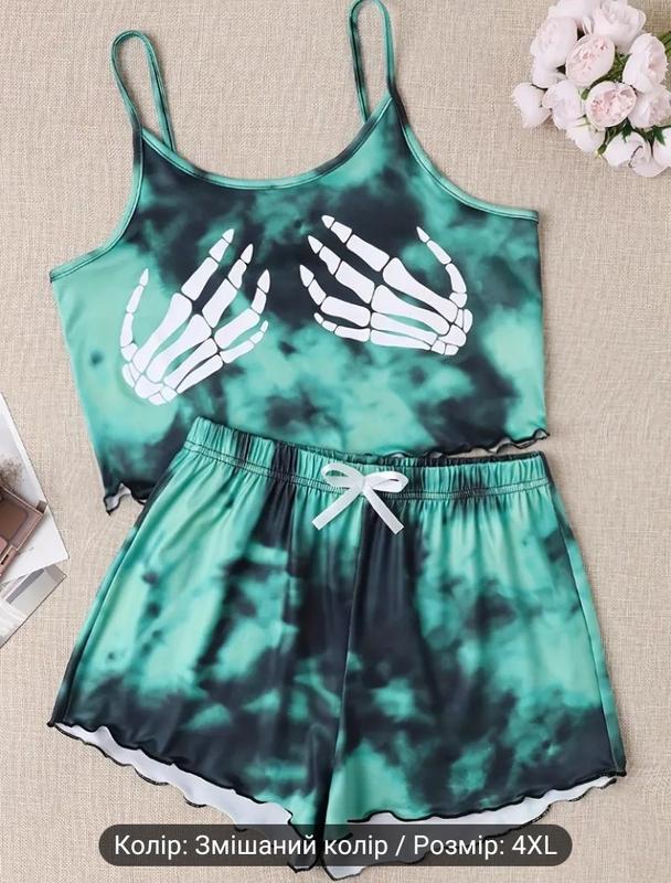 Набор модных пижам для празднования Хэллоуина и отдыха. Топ и шорты с принтом скелетных рук для женщин размера плюс сайз. Размер комплекта 4xl (Бюст: 125-131 см; Талия: 110-116 см; Бедра: 135-141 см). Замеры топа: Полу обхват- 59 см Высота переда- 28 см Высота спинки - 18 см Замеры шорт: Полу обхват тела - 50 см Полу обхват бедер - 75 см Высота - 37 см