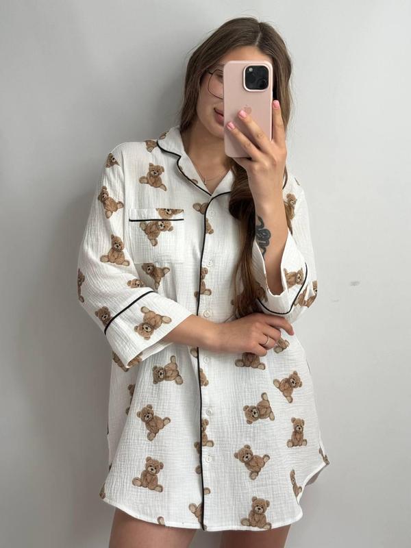 Жіноча муслінова подовжена сорочка для дому та сну на ґудзиках біла з ведмежатами