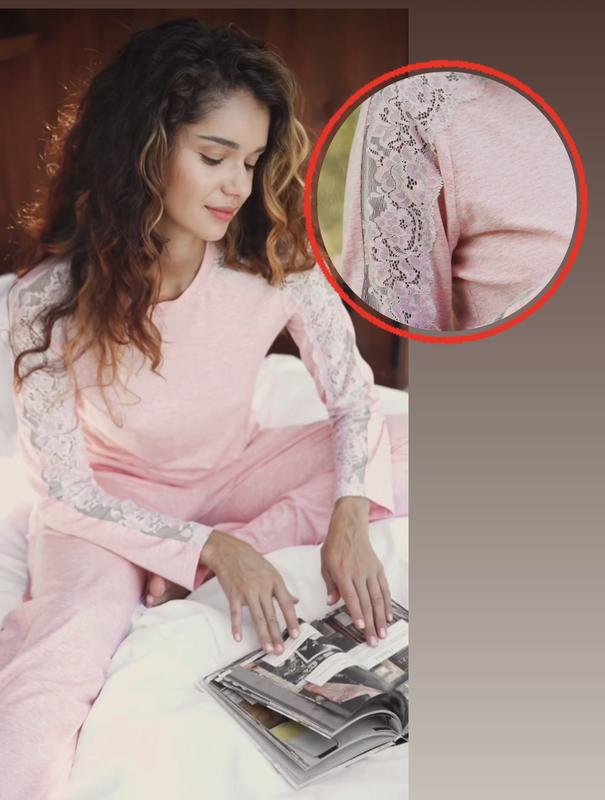 Склад: 82% модал, 12% бавовна, 6% еластан. Рожева піжама з модалу. Рукави ковтки оздоблені мереживом. Штани прямого крою. Дуже приємна на дотик.