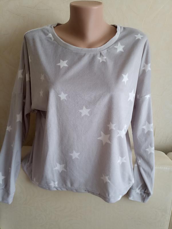 М'якенька. велюрова кофта, сірого кольору у білу зірку. Розмір М: ПОГ 58, довжина 53, рукав 69 (от шеи)