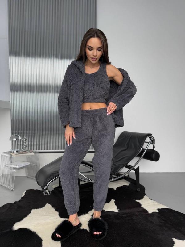 Піжама трійка Модель: 349 🤍Тканина: Турецька двухстороння махра Колір: беж, молоко, графіт, шоколад. Розмір: 42-44, 46-48 Вишукана якість тканини, дуже приємна до тіла. Доповнить ваш домашній комфорт.