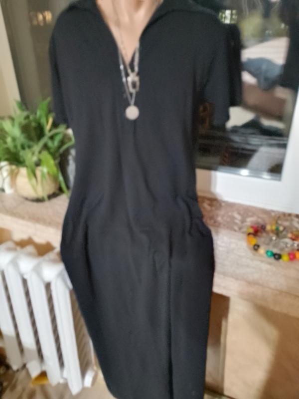 Классическое платье , в пол. Длина -149 см, от плеча. рукав, короткий-25,плечо-14, Пог-55, тянется до-61, Пог- талия-51.Воротник- поло, планка на пуговицах, пуговиц-4, Дл,планки-35. Ткань, трикотаж, похоже на ХБ, с эластичной ниткой. Цвет, глубокий, черный .