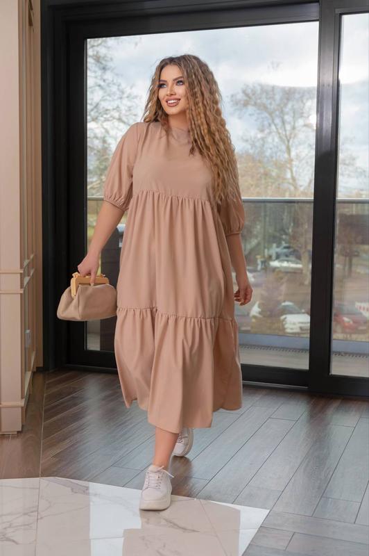 Платье Номер: 2063jebu Ткань: софт (лёгкая и прохладная) Цвет: малина, бежевый, хаки Размер: 48-50, 52-54, 56-58 Примечание: платье с воланами, широкого и свободного кроя, на спинке завязывается на бантик.