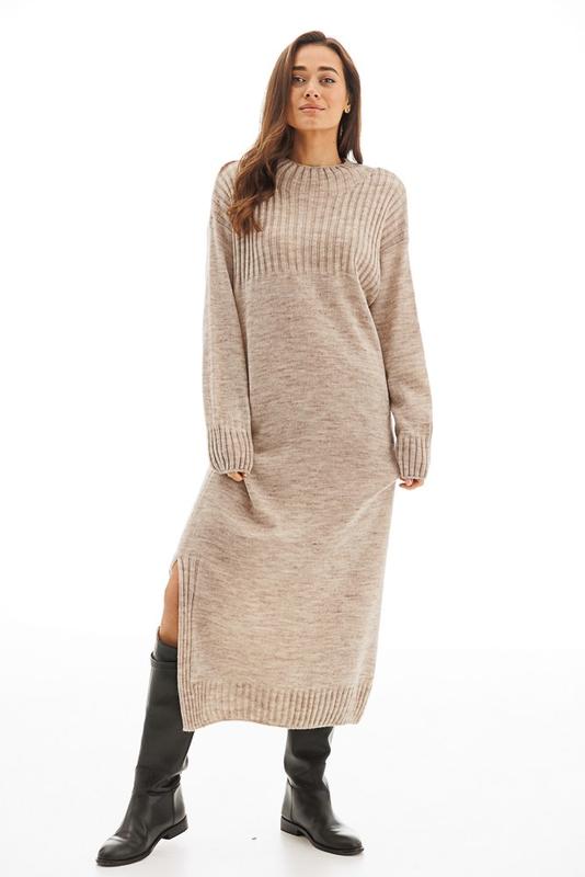 Універсальна бежева сукня із машинної в'язки - це любов з першої примірки! Ти можеш доповнювати її взуттям, одягом та аксесуарами будь-яких стилів та кольорів, змінюючи акценти за настроєм.