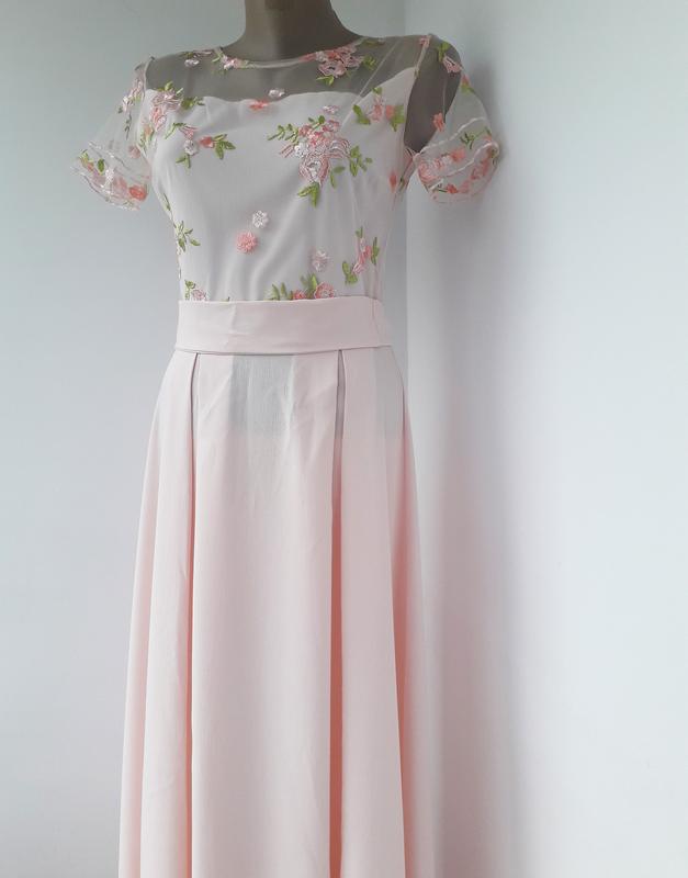 Гарна сукня Виконана з щільного шифону, верх оздоблений сіточкою і мереживом. Пудрового кольору Розмір:M