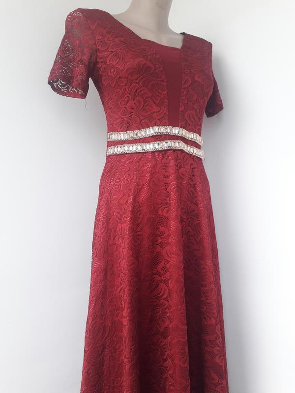 Вечірня сукня Виконана з гіпюру. На талії оздоблена камішками. Колір марсала