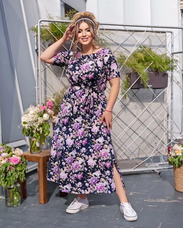 Плаття Модель 843VL Ціна 750 грн Розміри: 48-50,52-54,56-58 Тканина: суперсофт Кольори : Піон, Тюльпан , Лілові квіти Вільна сукня в підлогу, з боків розрізи, верх сукні на широкій резинці, спускається на плечі. Рукави три чверті, внизу широка резинка на рукавах. Талія фіксується з’ємним пояском. Параметри моделі ОГ110-ОТ86-ОБ110, зріст 165см, на ній представлено 48-50. Параметри зовнішнього шва виробу: 48-50: ОГ114, ОТ124, рукав 30, довжина 118; 52-54: ОГ118, ОТ128, рукав 31, довжина 120; 56-58: ОГ122, ОТ132, рукав 32, довжина 120. Дані