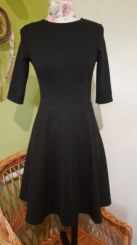 Елегантна чорна приталена до пояса сукня з блискавкою ззаду . "Маленьке чорне плаття " обовязкове в гардеробі кожної жінки . Пог 40 см ,тягнеться , пот 32 см , тягнеться . Довжина 91см . Не мнеться , буде добре пратись . Охоче відповім на запитання, зроблю додаткові фото .