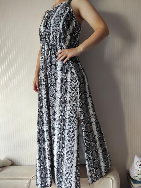 Сарафан, длинное платье в змеиный принт с разрезами по бокам, на регулируемых бретелях. Размер 16, наш 52-54. Длина 140/150, ПОГ 55-60, ПИТ-ГУМКА 35-60, ПОБОДЫ 65-70, низ свободно. Стан идеален!