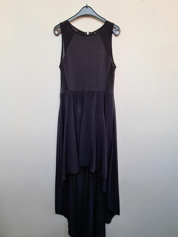 Стильне плаття H&M divided 36 розміру, на S/невелику М. Дуже гарно сидить, тканина щільна еластична, тканина верхньої спідниці вміру прозора і майже не мнеться. Спідниця від талії 41 см, довжина по спинці до талії 34 см, плечі 31 см, груди 40 см, талія 35 див. Нюанс: спереду праворуч на верхній невелика більш світла плямочка від праски 2х1 см, в носінні не видно взагалі (див. фото 4). В-цілому стан відмінний, одягала двічі на заходи.