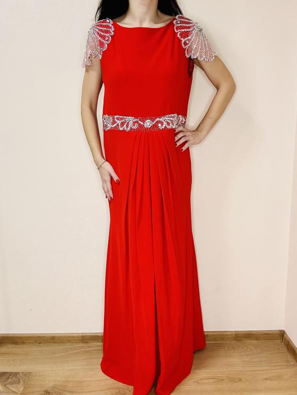 Сукнею яскравого червоного кольору оздоблена камінням та бісером, налитим ручною роботою ПО груди51-50,ПО талії 47, довжина виробу 145,ПО бедер56-55
